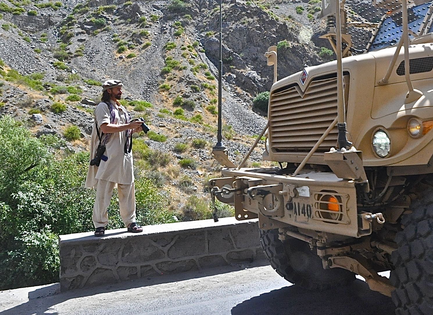 [The author observing U.S. military presence from a local vantage point and dressed in traditional clothes; loose-fitting shalwar kameez, scarf and wool pakol cap and sandals. Eastern Afghanistan 2013.(Photo by Alex Pena)]